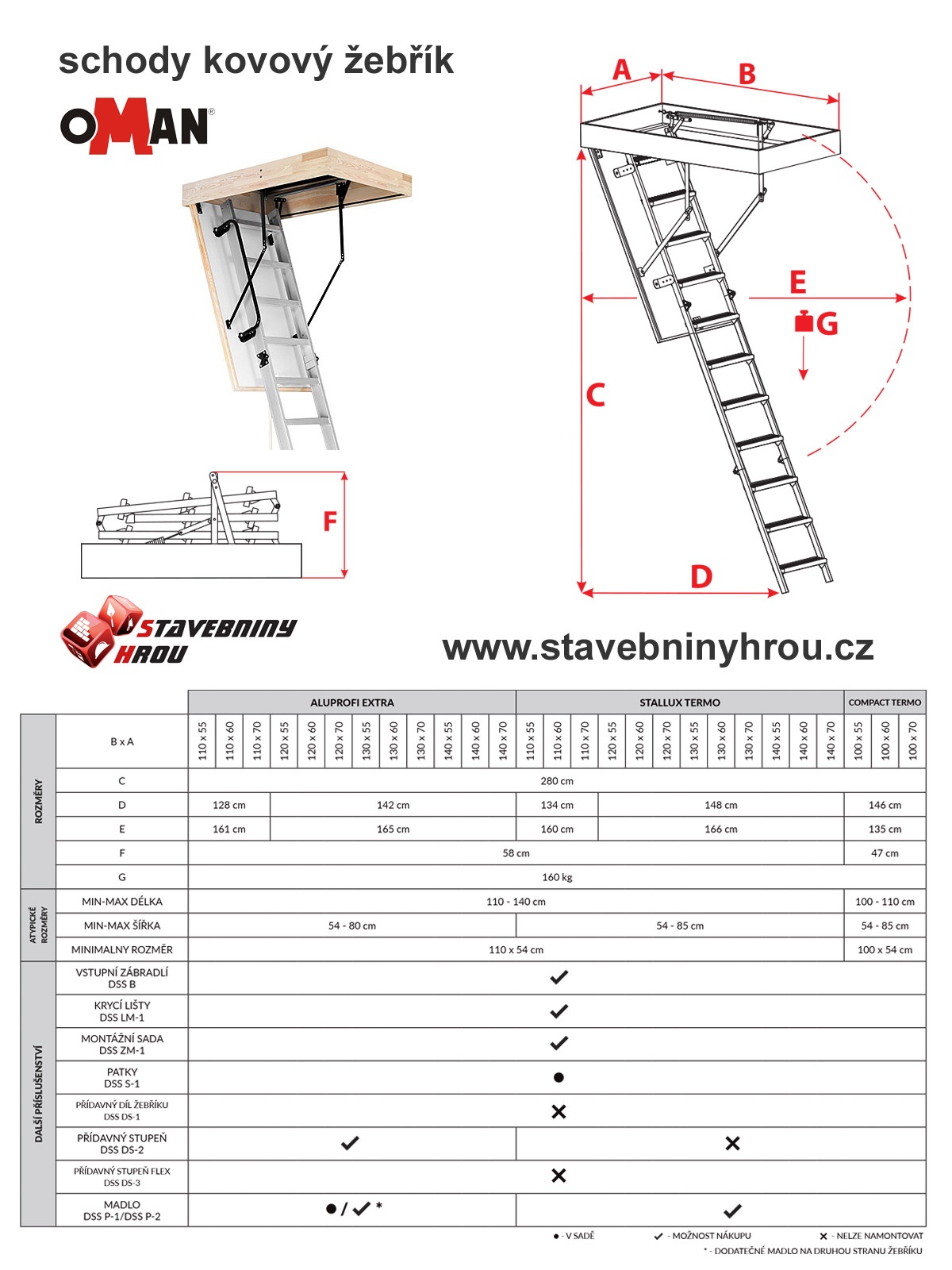 Hliníkové schody se vyrábí ve 12 půdorysných rozměrech a maximální světlé výšce 2800mm. Stavební otvor doporučujeme o 10-20mm větší, než je udávaný rozměr schodů. Pro menší světlé výšky místností, je možno žebřík seříznout. Maximální přípustná zátěž je 160kg.