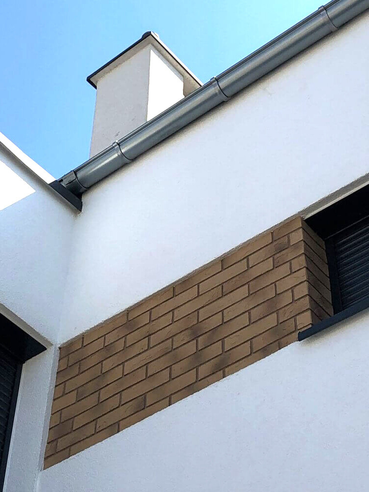 Cihelný obklad se na penetrovaný podklad lepí flexibilním tmelem Izoflex, který nanášíme zubovou stěrkou o velikosti zubu 4mm. Po té se kladou jednotlivé cihličky, tak aby mezi nimi vznikla spára 10-13mm. Tato spára se ještě za čerstva přetře mokrým štětcem a tím začistí.