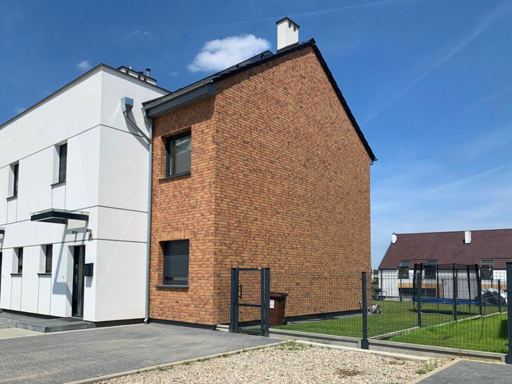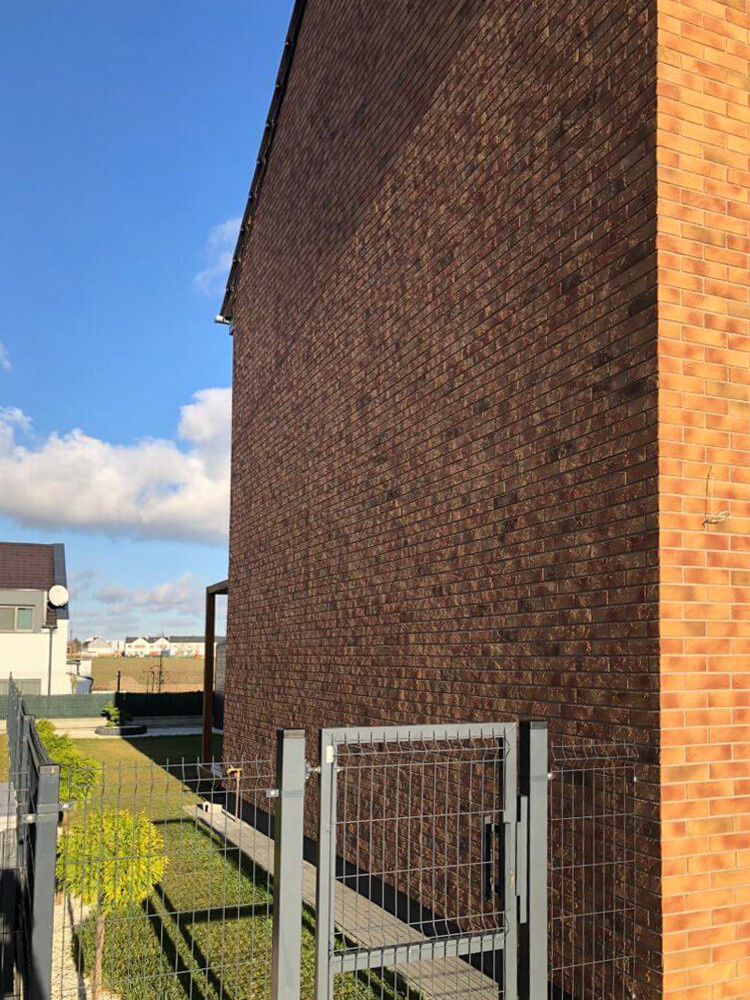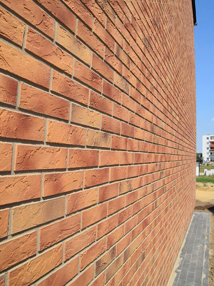 Cihelný obklad se na penetrovaný podklad lepí flexibilním tmelem Izoflex, který nanášíme zubovou stěrkou o velikosti zubu 4mm. Po té se kladou jednotlivé cihličky, tak aby mezi nimi vznikla spára 10-13mm. Tato spára se ještě za čerstva přetře mokrým štětcem a tím začistí.