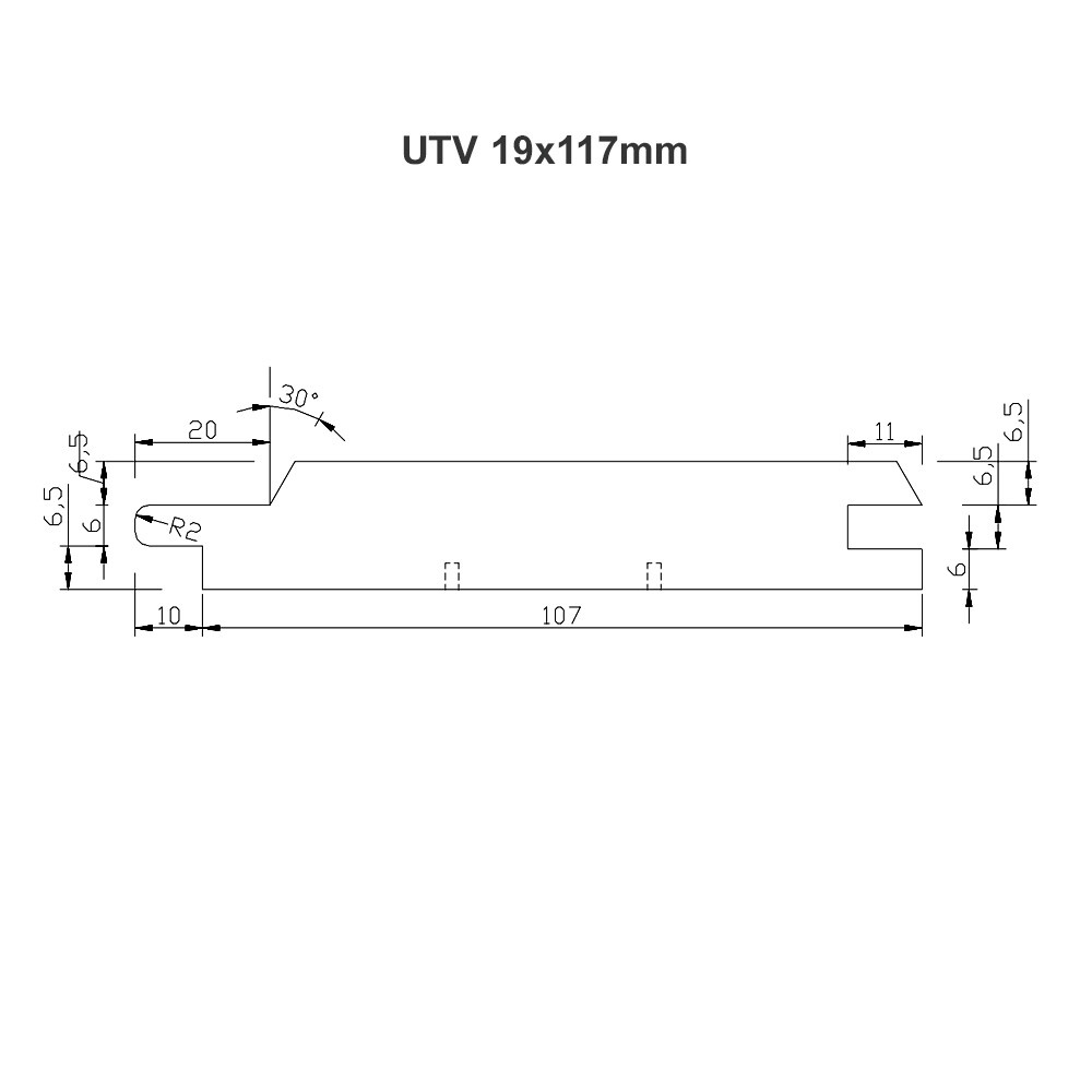 Fasádní palubka UTV 19x117mm je opatřena pérem a drážkou, dodává v délce 3 a 4,2m ve kvalitě A. Působením povětrnosti fasádní palubka přirozeně šedne, jako každé dřevo. Tomu lze zabránit aplikací olejového nátěru Owatrol Aquatherm ihned po montáži, nebo je-li fasáda již starší, použitím odšeďovače Owatrol Net-Trol a následným nátěrem Aquatherm.