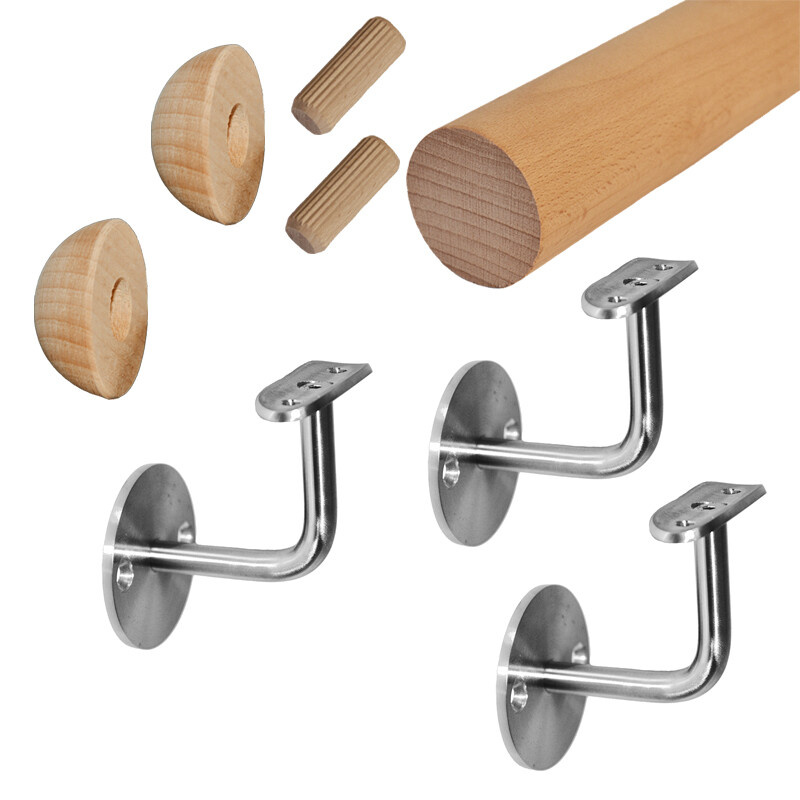 Dřevěné madlo na schodiště je plně zkompletované, obsahuje 3 nerezové držáky madla ED1-4300 s pevným sklonem, bukové madlo a dvě půlkulaté bukové koncovky.