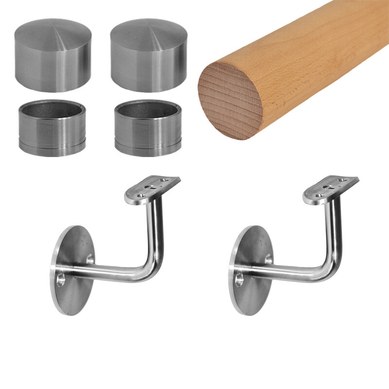 Dřevěné madlo na schodiště je plně zkompletované, obsahuje 2 držáky madla EDB1-4300 s pevným sklonem, bukové madlo a dvě nerezové koncovky.