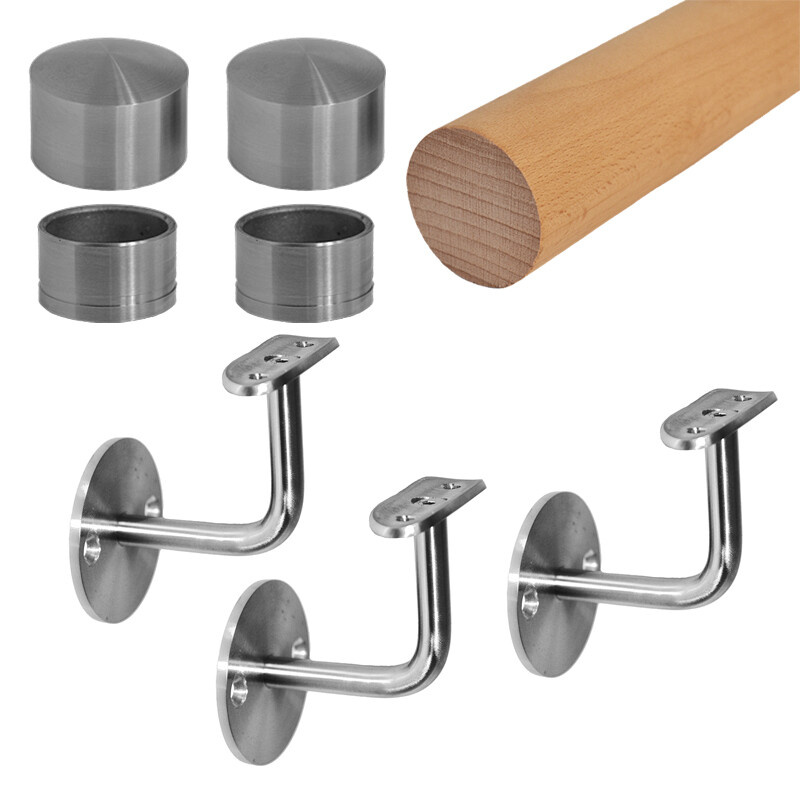 Dřevěné madlo na schodiště je plně zkompletované, obsahuje 3 držáky madla EDB1-4300 s pevným sklonem, bukové madlo a dvě nerezové koncovky.