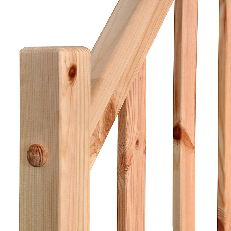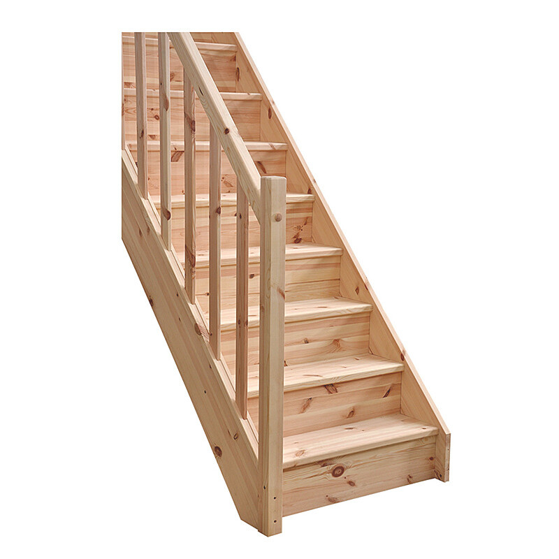 Dřevěné schodiště je vyrobeno z blokově lepeného dřeva, což zvyšuje jeho tuhost. Je opatřené jednostranným madlem. To lze připevnit vpravo i vlevo. Stupně i schodnice mají tloušťku 28mm. Stupňů je 13, jsou 145mm hluboké a světlá šířka je 800mm. Schodiště bez úprav je určené pro světlou výšku místnosti 3000mm. Pro menší výšky lze upravit schody seříznutím na stavbě. Šíře ramene včetně schodnic a madla je 800mm.