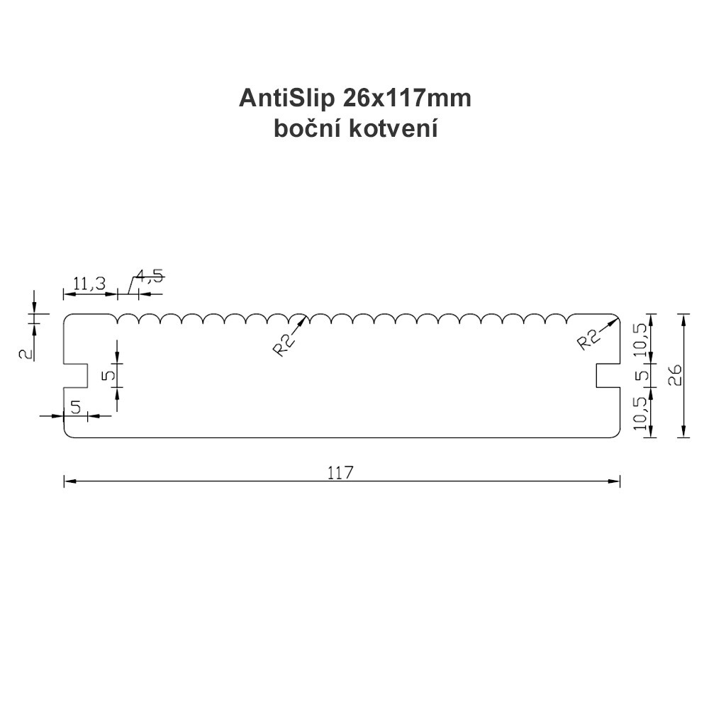 Terasové prkno Antislip 26x117mm je opatřeno drážkou pro boční úchyty tvaru T, pomocí kterých se kotví k podkladním hranolům SHP. Dodává v délce 3 a 4,2m ve kvalitě A. Působením povětrnosti terasové prkno přirozeně šedne, jako každé dřevo. Tomu lze zabránit aplikací olejového nátěru Owatrol Aquatherm ihned po montáži, nebo je-li terasa již starší, použitím odšeďovače Owatrol Net-Trol a následným nátěrem Aquatherm.
