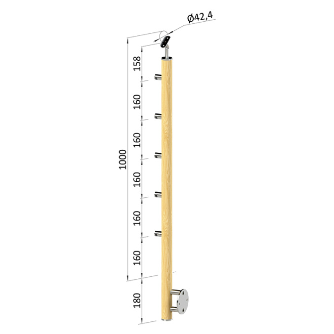 Dřevěný sloupek má průměr 42,4mm. Výška sloupku je 1137,6mm a po namontování madla vytvoří zábradlí o celkové výšce 1m. Sloupky nerezového zábradlí se osazují osově ve vzdálenosti 800-1200mm.