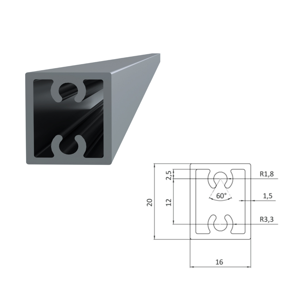 Hliníkový profil se dodává v rozměru 20x16mm a délce 6m bez povrchové úpravy.