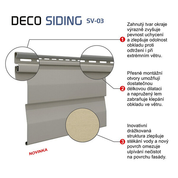 Fasádní obklad Deco Siding slouží k obkládání budov formou provětrávaných fasád, ať už zateplených nebo prostých zavěšených fasád. Mezi přednosti systému patří snadná montáž, nízká hmotnost, trvanlivost a omyvatelnost. Montáž systému Deco Siding zvládnou i kutilové.