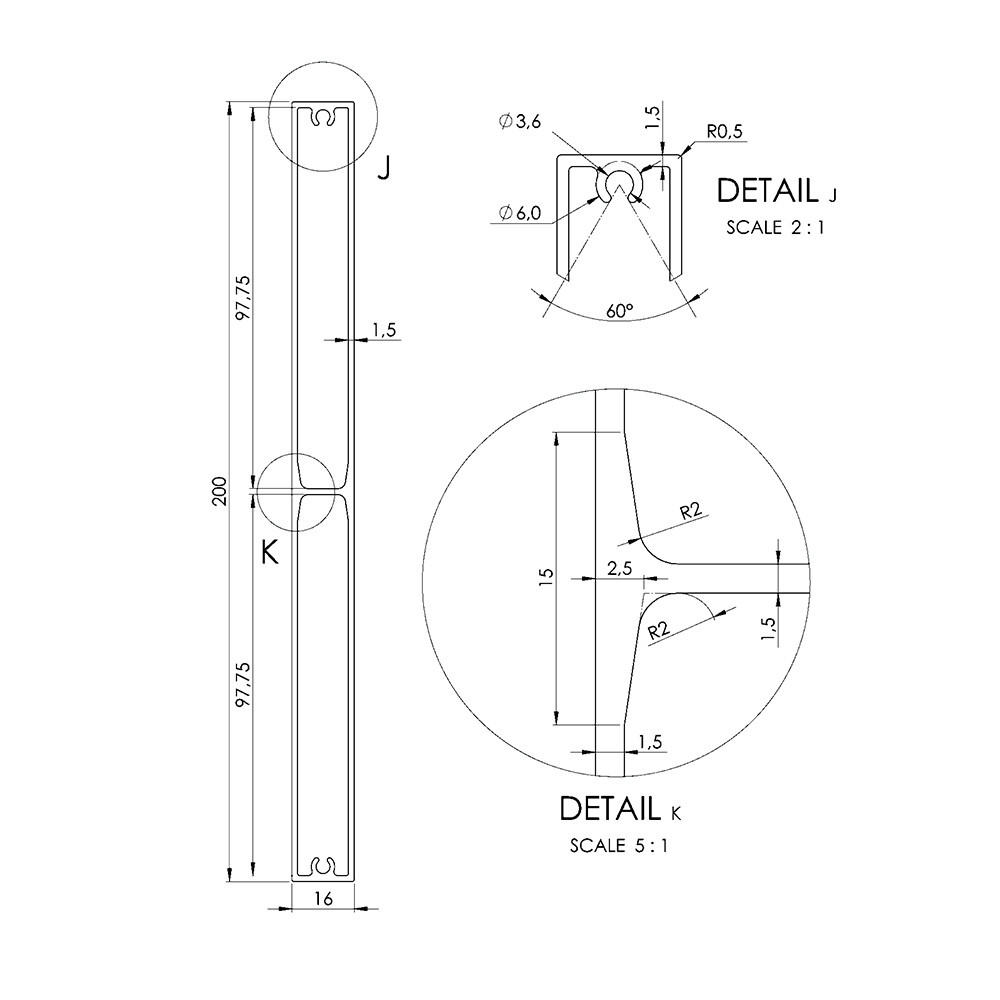 Hliníková lamela se dodává v rozměru 200x16mm a délce 6m s jemně zrnitou povrchovou úpravou. Odstín RAL7016.