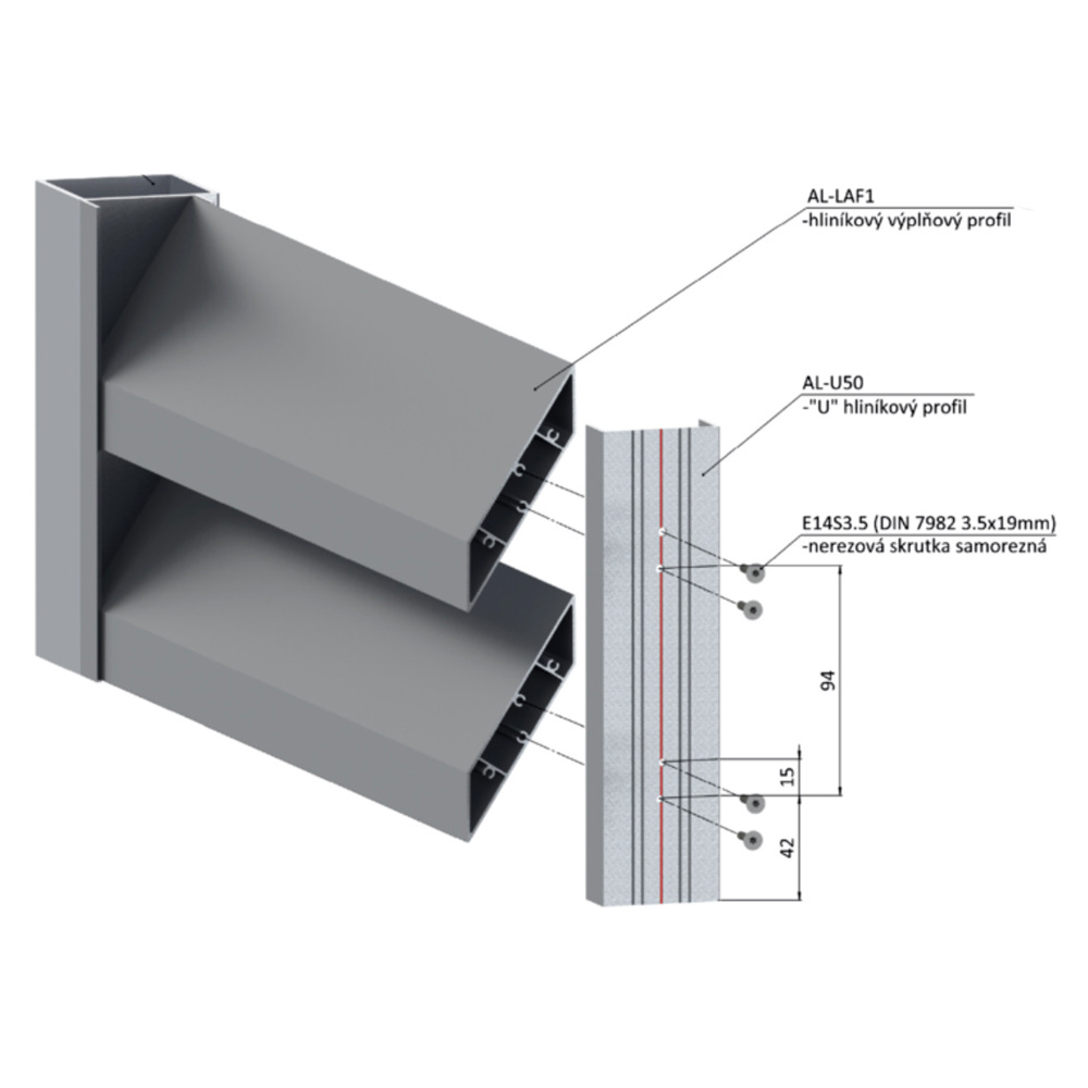 Profily jsou vyrobené z přírodního hliníku EN AW-6060 T66. Profil má na stojině z vnější strany naznačenou drážku pro šroubování nerezových vrutů, k hliníkovým lamelám. V tomto případě budou lamely k U profilu připevněny skosený. S jejich pomocí pak vytvoříte samonosné plotové pole.