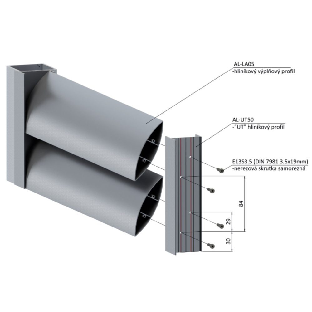 Tento systém umožňuje montovat celá výplňová pole, jen za pomocí nerezových vrutů, bez nutnosti sváření hliníku. Doporučená velikost polí je do 2m. V případě delších pak je nutné použít výztuhy.
