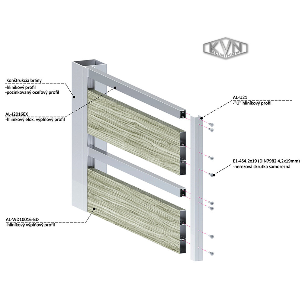 Profily jsou vyrobené z přírodního hliníku EN AW-6060 T66. Profil má na stojině z vnější strany naznačenou drážku pro šroubování nerezových vrutů, k hliníkovým lamelám tloušťky 16mm. S pomocí těchto lamel pak vytvoříte samonosné plotové pole.