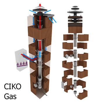 Komínový systém CIKO® Gas je kompletní jednoprůduchový komín pro kotle na plynná a kapalná paliva, kde výstupní teplota v sopouchu je nižší než 120 stupňů. Je vhodný pro klasické plynové kotle a zejména pro kondenzační a turbokotle.