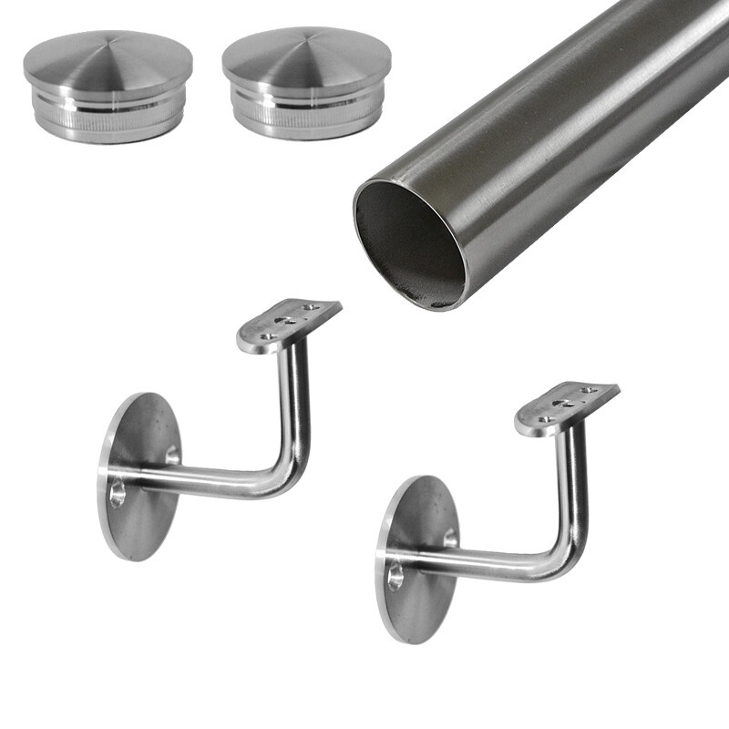 Madlo na schodiště je plně zkompletované, obsahuje 2 držáky madla EB1-4300 s pevným sklonem, trubku madla a dvě záslepky.
