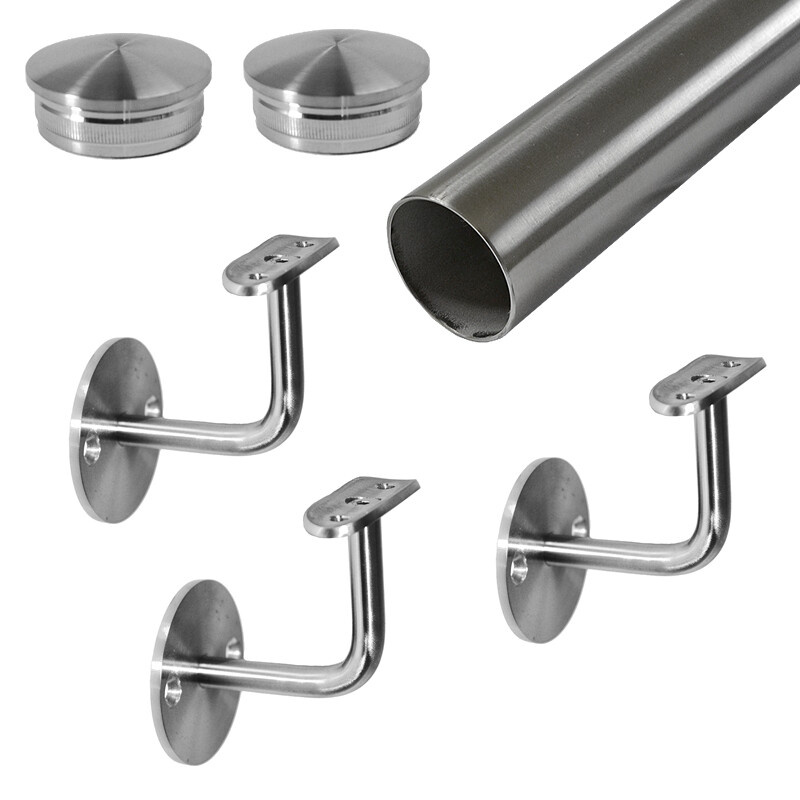 Madlo na schodiště je plně zkompletované, obsahuje 3 držáky madla EB1-4300 s pevným sklonem, trubku madla a dvě záslepky.