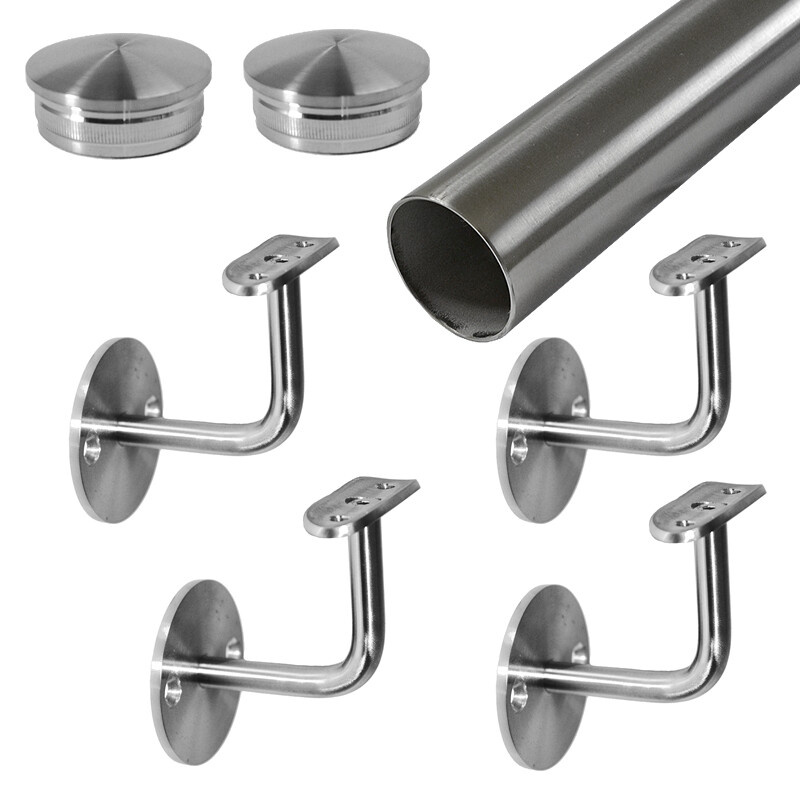 Madlo na schodiště je plně zkompletované, obsahuje 4 držáky madla EB1-4300 s pevným sklonem, trubku madla a dvě záslepky.