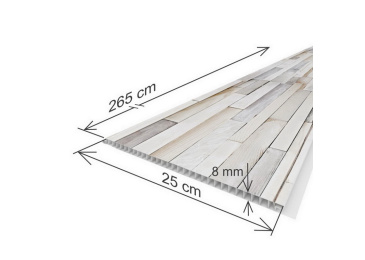 Obkladový panel o síle 8mm se dodává ve skladebné šířce 250mm a délce 2,65m. V balení jsou 4ks = 2,65m2.
