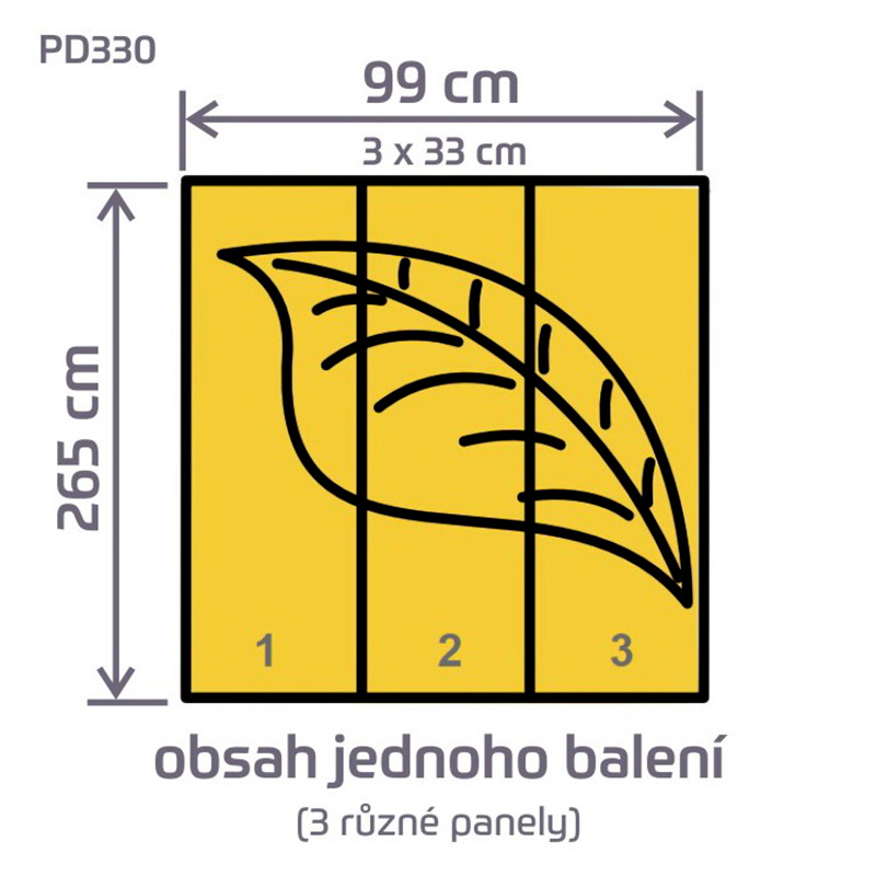 Obkladový panel o síle 8mm se dodává ve skladebné šířce 330mm a délce 2,65m. V balení jsou 3ks = 2,63m. Ty tvoří celistvý motiv, jenž pak plynule navazuje na sousední.
