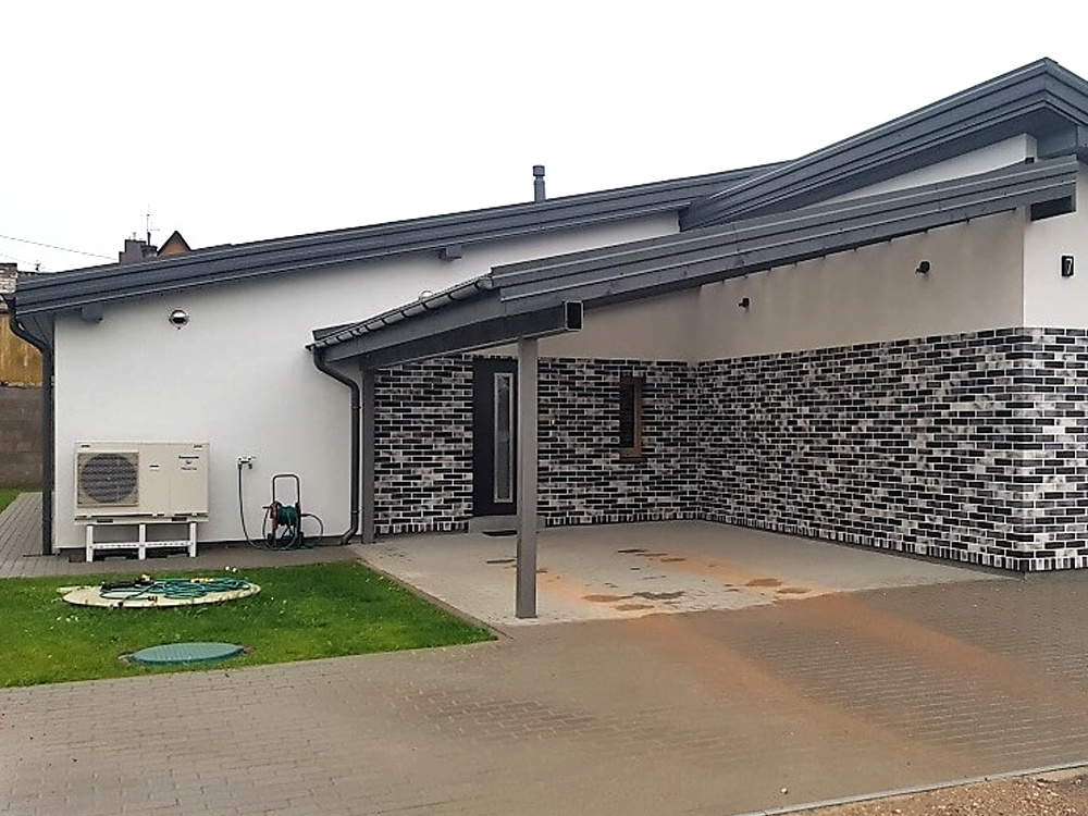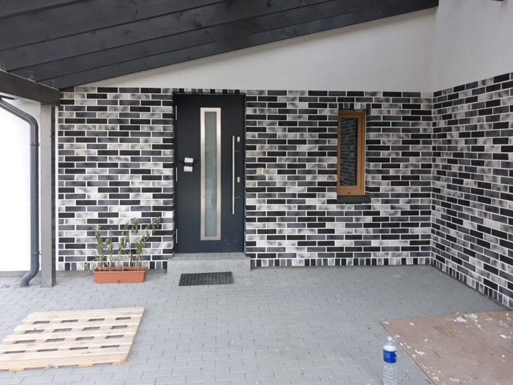 Obkladový pásek se na penetrovaný podklad lepí flexibilním tmelem Izoflex, který nanášíme zubovou stěrkou o velikosti zubu 4mm. Po té se kladou jednotlivé cihličky, tak aby mezi nimi vznikla spára 10-13mm. Tato spára se ještě za čerstva přetře mokrým štětcem a tím začistí.