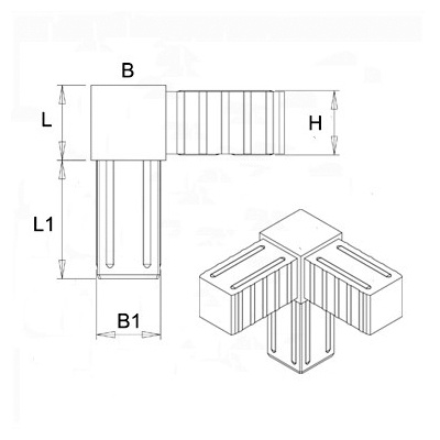 Plastová spojka se používá jako spojovací prvek hliníkových uzavřených profilů. Tato spojka umožňuje spojení 3 částí, do rohu. Dodává se pro tři velikosti profilů.
