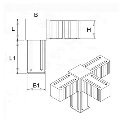 Plastová spojka se používá jako spojovací prvek hliníkových uzavřených profilů. Tato spojka umožňuje spojení 4 částí. Dodává se pro tři velikosti profilů.