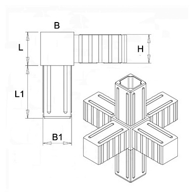 Plastová spojka se používá jako spojovací prvek hliníkových uzavřených profilů. Tato spojka umožňuje spojení 6 částí. Dodává se pro tři velikosti profilů.