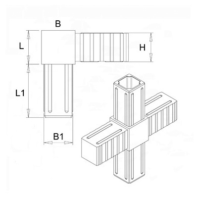 Plastová spojka se používá jako spojovací prvek hliníkových uzavřených profilů. Tato spojka umožňuje spojení 4 částí, do kříže. Dodává se pro tři velikosti profilů.