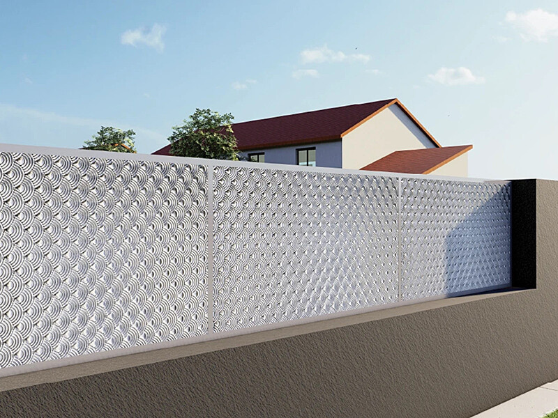 Pozinkovaný plech s vylisovaným 3D vzorem se hodí na výplň plotových polí, nebo stěn kovových konstrukcí.