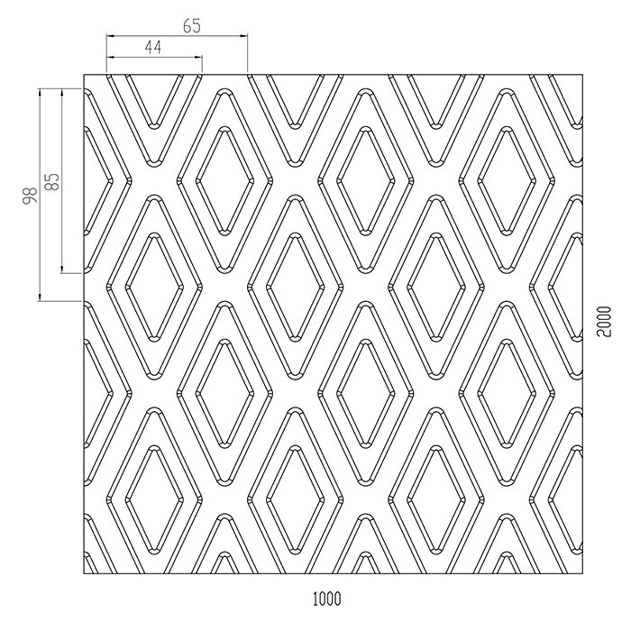 Vylisovaný vzor - kosočtverec, má rozměr 85x44mm. Výplňový plech se dodává se v rozměru 1990x950x1,2mm o hmotností 18,9kg. Tolerance rozměru +/- 0,5%.