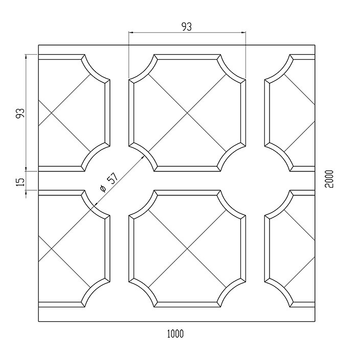 Vylisovaný vzor - tvar pyramida má základnu 93x93mm. Výplňový plech se dodává se v rozměru 1990x950x1,2mm o hmotností 18,9kg. Tolerance rozměru +/- 0,5%.