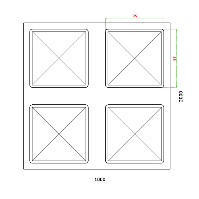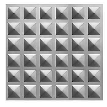 Vylisovaný vzor - tvar pyramida má základnu 95x95mm. Výplňový plech se dodává se v rozměru 2000x1000x1,2mm o hmotností 18kg. Tolerance rozměru +/- 0,5%.