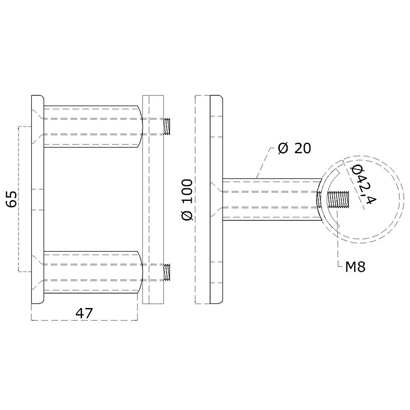 Tento nerezový sloupek je kompletně vystrojený. Součástí je příruba pro boční kotvení, spodní krytka, 6 držáky pro vnější vodorovnou prutovou výplň a krček madla s pevným sklonem. Samotnou boční přírubu je možno zvolit jinou.