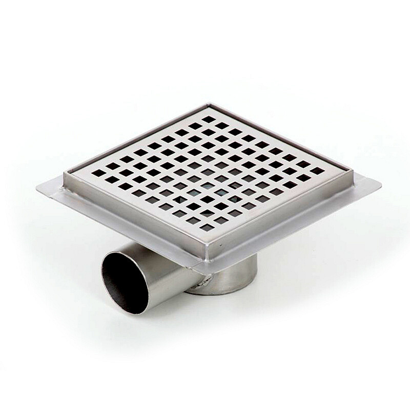 Podlahová vpusť má přírubu pro zabudování, nerezový sifon s odtokem 40mm, pak je výška vpustě 65mm, nebo nebo odtokem 50mm, pak je vpusť vysoká 75mm. Samotná podlahová vpusť je vyrobená z kvalitní nerezi a dodává se v rozměrech 100x100mm, 150x150mm a 200x200mm.