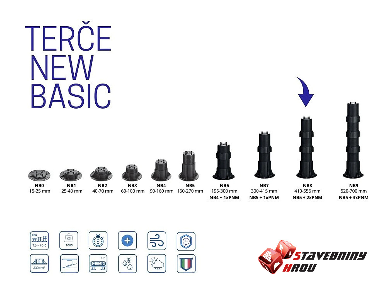 Podložka pod dlažbu NB3, je nejednoduší výškově stavitelný prvek pro pokládku externích dlažeb ve svažitém terénu. Používá se na pokládku chodníků, teras, ploch kolem bazénů. Výhodou pokládky na stavitelné podložky je jednak možnost výškové korektury, ale díky křidélkům i snadné dodržení síly spáry, která pak dobře odvádí vodu do podkladu.