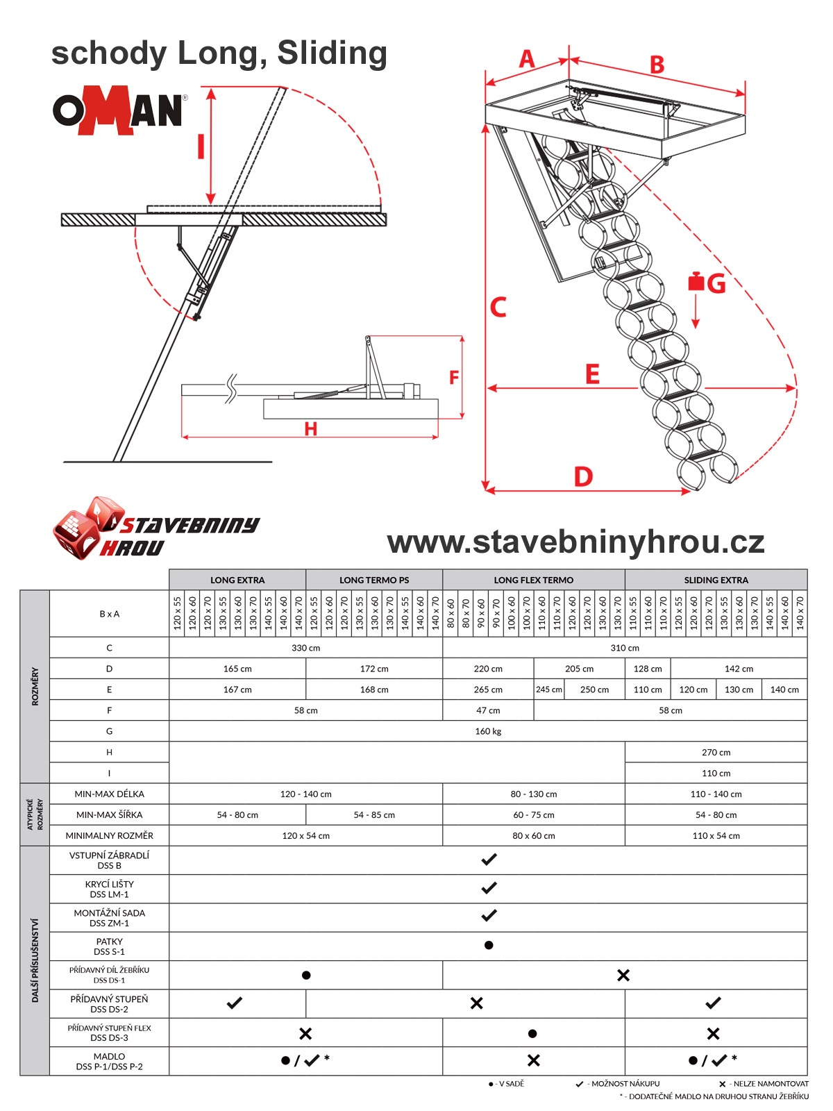 Stahovací schody se vyrábí ve 16 půdorysných rozměrech a světlé výšce max. 3100mm. Stavební otvor doporučujeme o 10-20mm větší, než je udávaný rozměr schodů. Pro menší výšky je možno žebřík zkrátit odmontováním stupně.