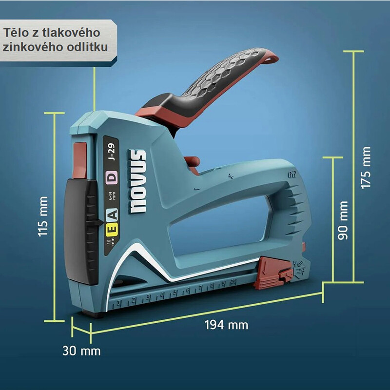 Sponkovačka Novus J29 je určená k ručnímu kotevní plošných materiálu k (dřevěnému) podkladu. Vhodná pro kotvení plastových palubek. Je určena pro spony 53x14mm, vyznačuje se nízkým zpětným rázem. Sílu úderu lze nastavovat.