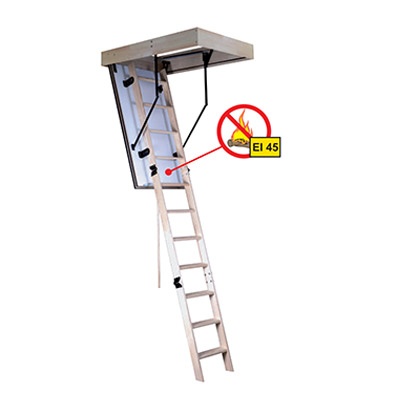 Protipožární schody jsou celodřevěné složené ze třech hlavních dílů. Zesíleného dřevěného rámu o výšce 170mm, protipožárního víka a vlastního žebříku. Protipožární víko má izolaci silnou 60mm ze je opatřeno oboustranně bílou MDF deskou. Víko je opatřeno dvojitým falcem s celoobvodovým těsněním, bránící šíření kouře. Na víku je namontován složený třídílný žebřík, bez gumových stopek. Protipožární schody jsou opatřeny párem ocelových pružin, které brzdí pád při otevírání a napomáhají při zavírání.