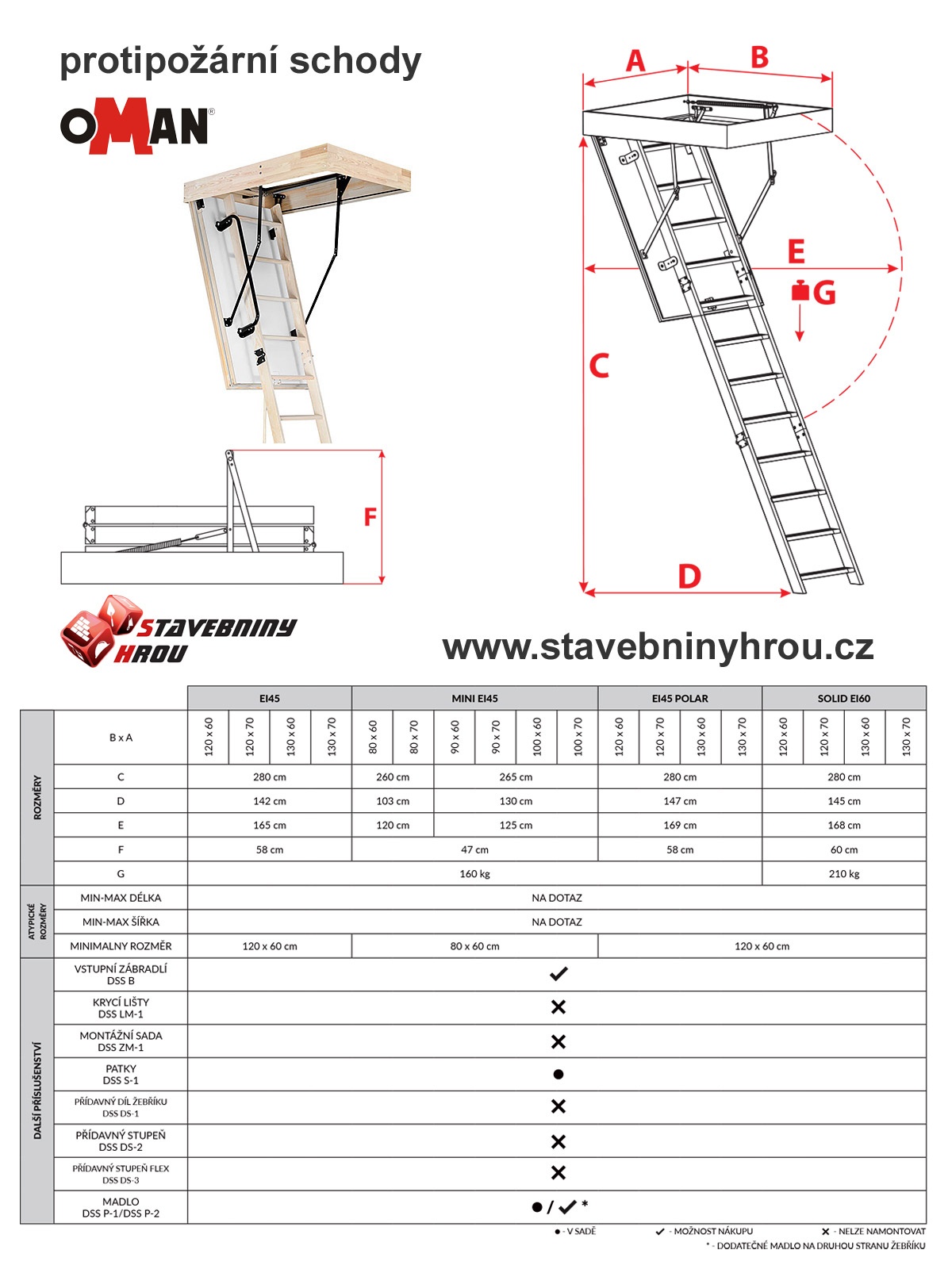 Protipožární schody se vyrábí ve 4 půdorysných rozměrech a světlé výšce max. 2800mm. Stavební otvor doporučujeme o 10-20mm větší, než je udávaný rozměr schodů. Pro menší světlé výšky místností, je možno žebřík seříznout. Maximální přípustná zátěž je 160kg.