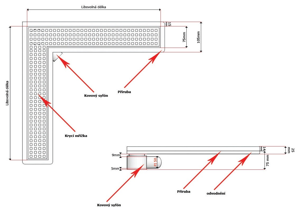 Sprchový žlab s přírubou je možno osadit do podlah o minimální výšce 75mm včetně dlažby.