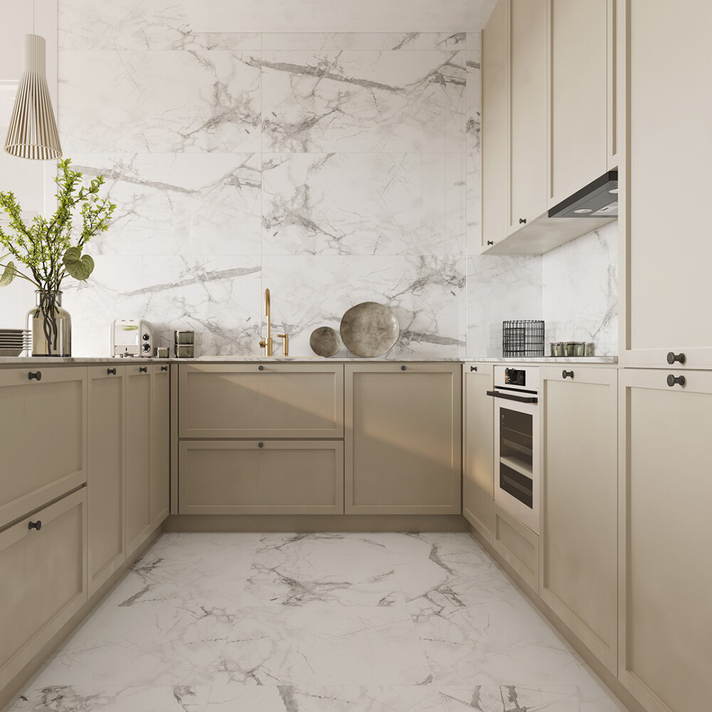 Vinylová podlaha Vilo SPC Calacatta Snow, je určená k bezespáré pokládce podlahy v interiéru jako dlažba. Je vhodná pro místnosti s vysokým provozem a zejména do míst s kontaktem s vodou, jako jsou koupelny, kuchyně, toalety. Výhodou je, díky zámkovému systému bezesparý povrch, odolnost proti otěru a protiskluzný povrch. Podlaha Vilo SPC je vyrobena unikátní technologií spojující kamenný prášek a pryskyřici. Tím vznikne jádro kompozitní desky SPC (Stone Polymer Composite). Na toto jádro je tištěn dekor, který je následně pokrytý UV odolnou vrstvou. Podlahy Vilo SPC se dodávají v provedení sametový mat.
