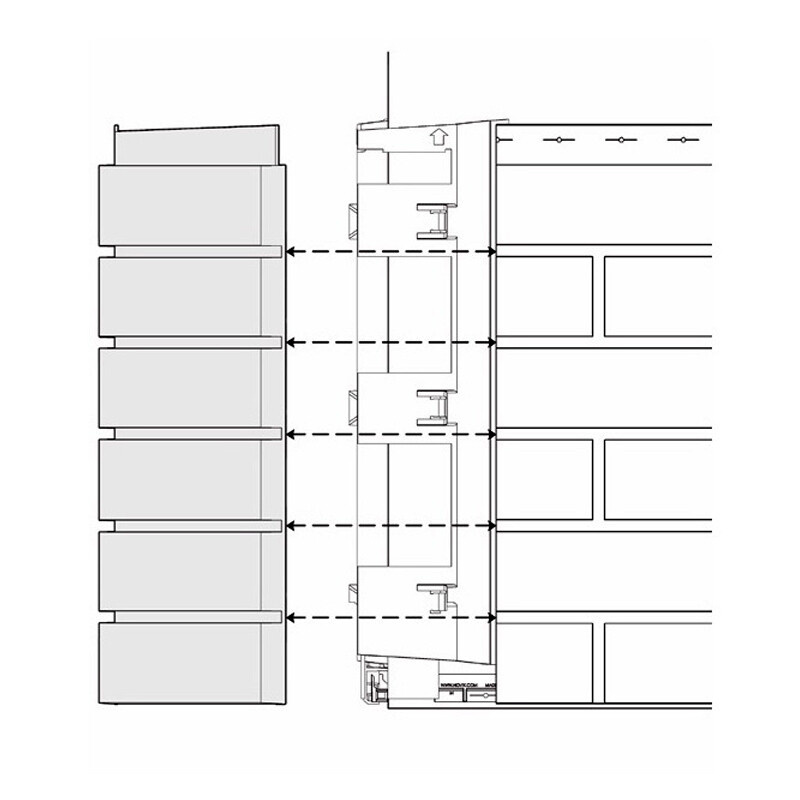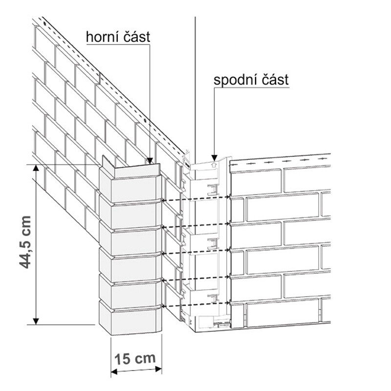Vnější roh Hand Laid Brick se používá na nároží fasád. Prvek je dvoudílný, kde se spodní díl montuje jako první před vlastními panely. Druhý se zacvakne po dokončení fasády. Dodává se ve stejných barvách jako obklady Hand Laid Brick. Na upevnění je zapotřebí 6ks vrutů. Roh a má výšku 445mm a šířku pohledově 155x155mm.