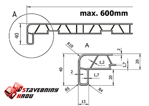Dodává se v šířkách 200, 300, 400 a 600mm a volitelné délce do 6m. Parapetní nos je 40mm vysoký, při tloušťce 13mm.