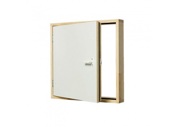 Stěnové dvířka se skládají ze dvou částí. Dřevěného rámu a vlastních dvířek. Dřevěný rám je zhotoven ze smrkových prken síly 30mm a hloubky 110mm. Dvířka jsou sendvičová s dvojitým falcem a dvojitým těsněním. Uvnitř jsou opatřena zateplením o síle 80mm (U dvířek = 0,36W/m2K).